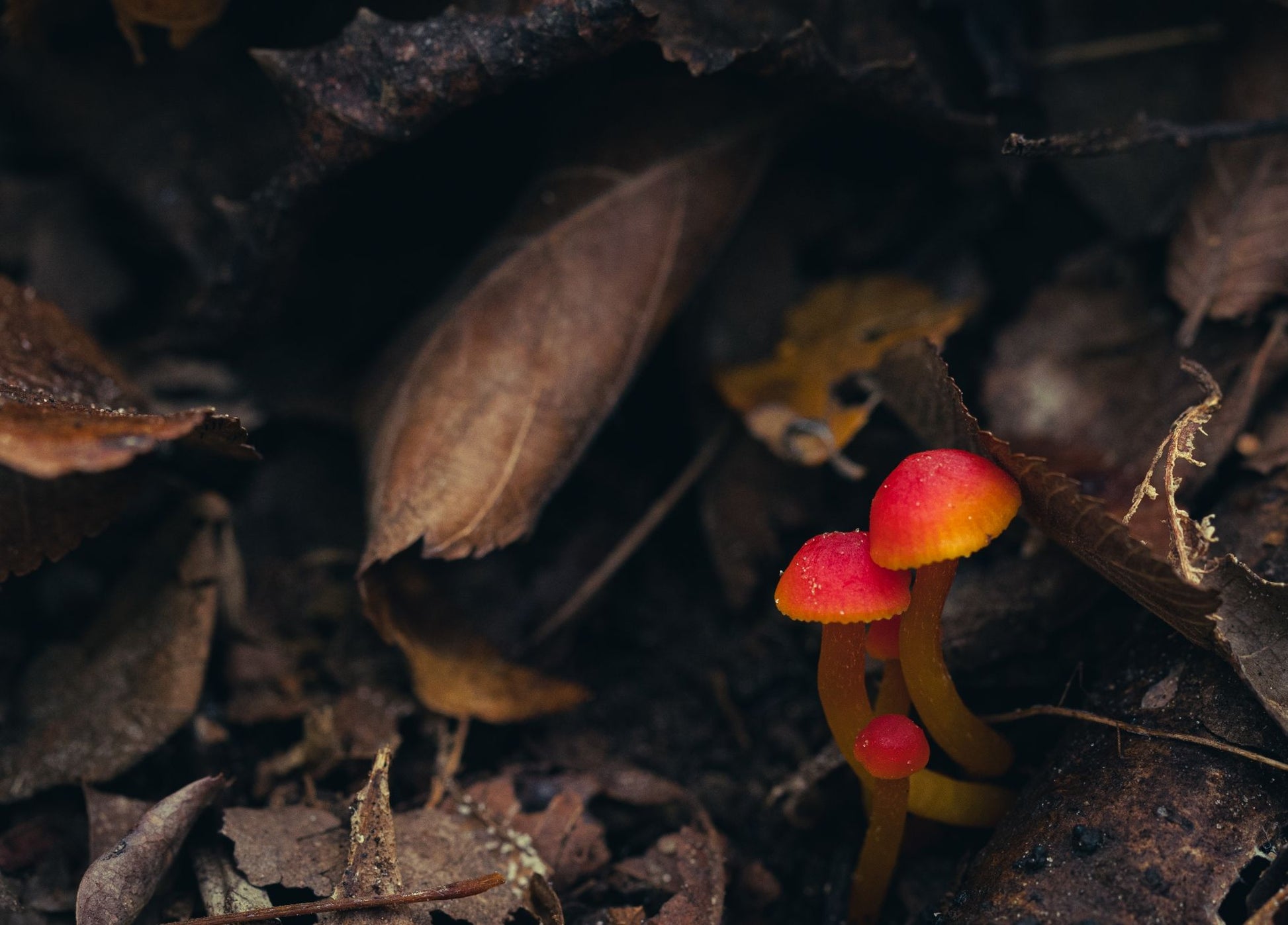 On a cloudy day during the winter, I spotted these small mushrooms poking their bright caps above the leaf litter on the trail that meanders through our woods.